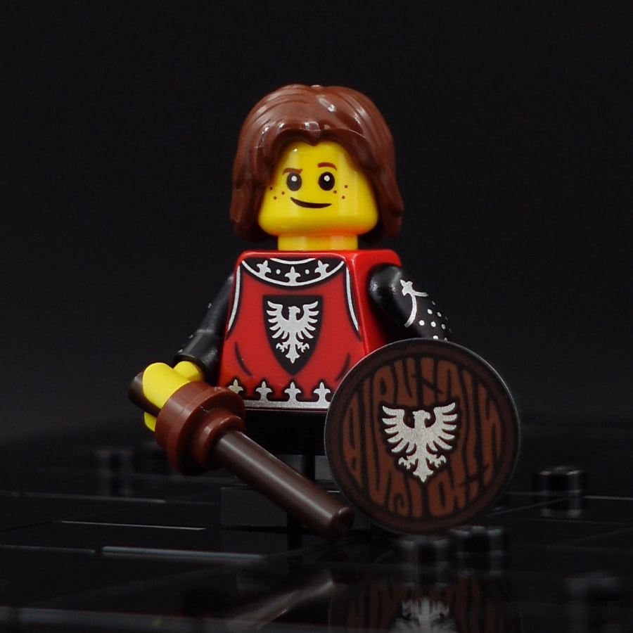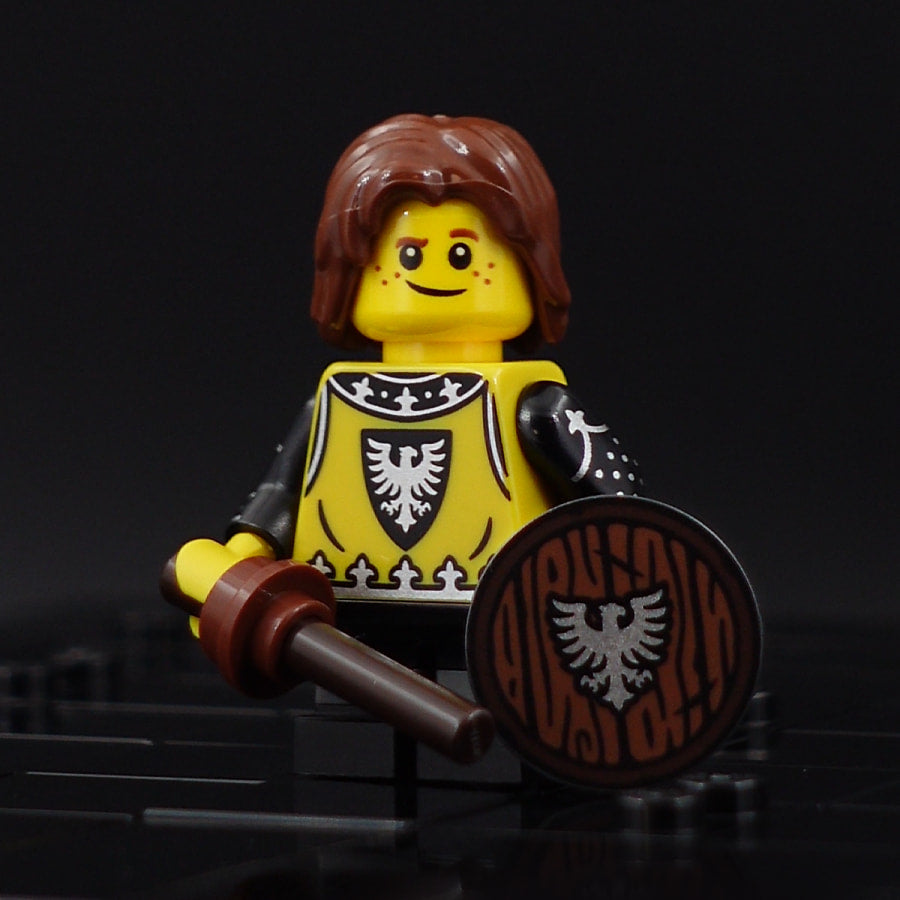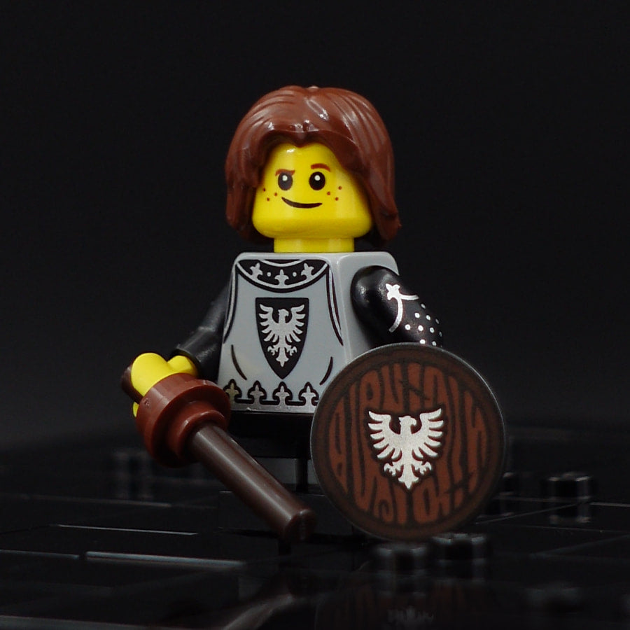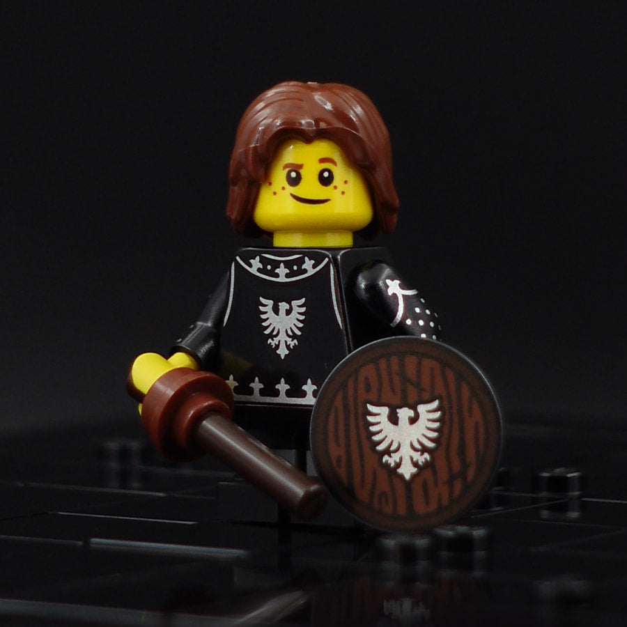 Motif: The heir to the Black Falcons faction. Consisting of a custom printed (modified) torso and shield element as well as the following unmodified original parts: head, hair, and leg elements, as well as two elements representing a wooden sword.