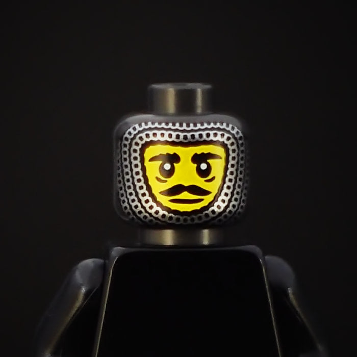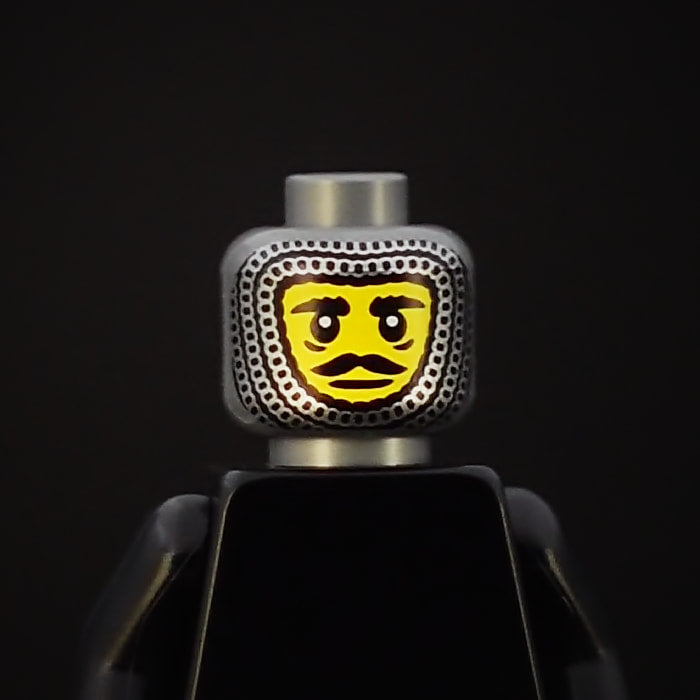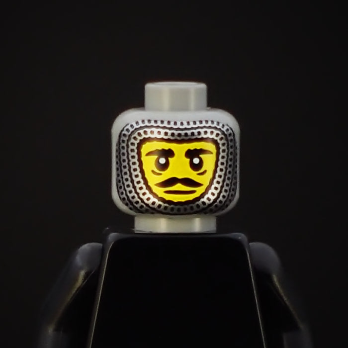 Motiv: Kettenhemd- und Gesichtsaufdruck eines Mannes mittleren Alters mit Schnauzer auf einem Kopfelement.
