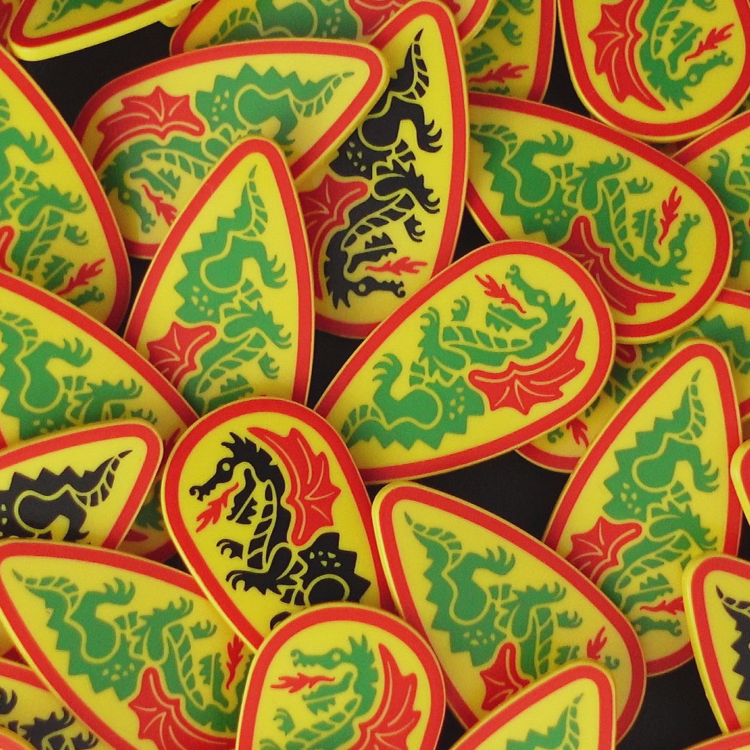 Motiv: Drache in Green und Randverzierung in Red auf einem Yellow Ovoid Shield Element, wenn Stil "Green" gewählt oder Drache in Black und Randverzierung in Red auf einem Yellow Ovoid Shield Element, wenn Stil "Black" gewählt oder Drache in Gold und Randverzierung in Red auf einem Yellow Ovoid Shield Element, wenn Stil "Year of the Dragon Edition" gewählt.