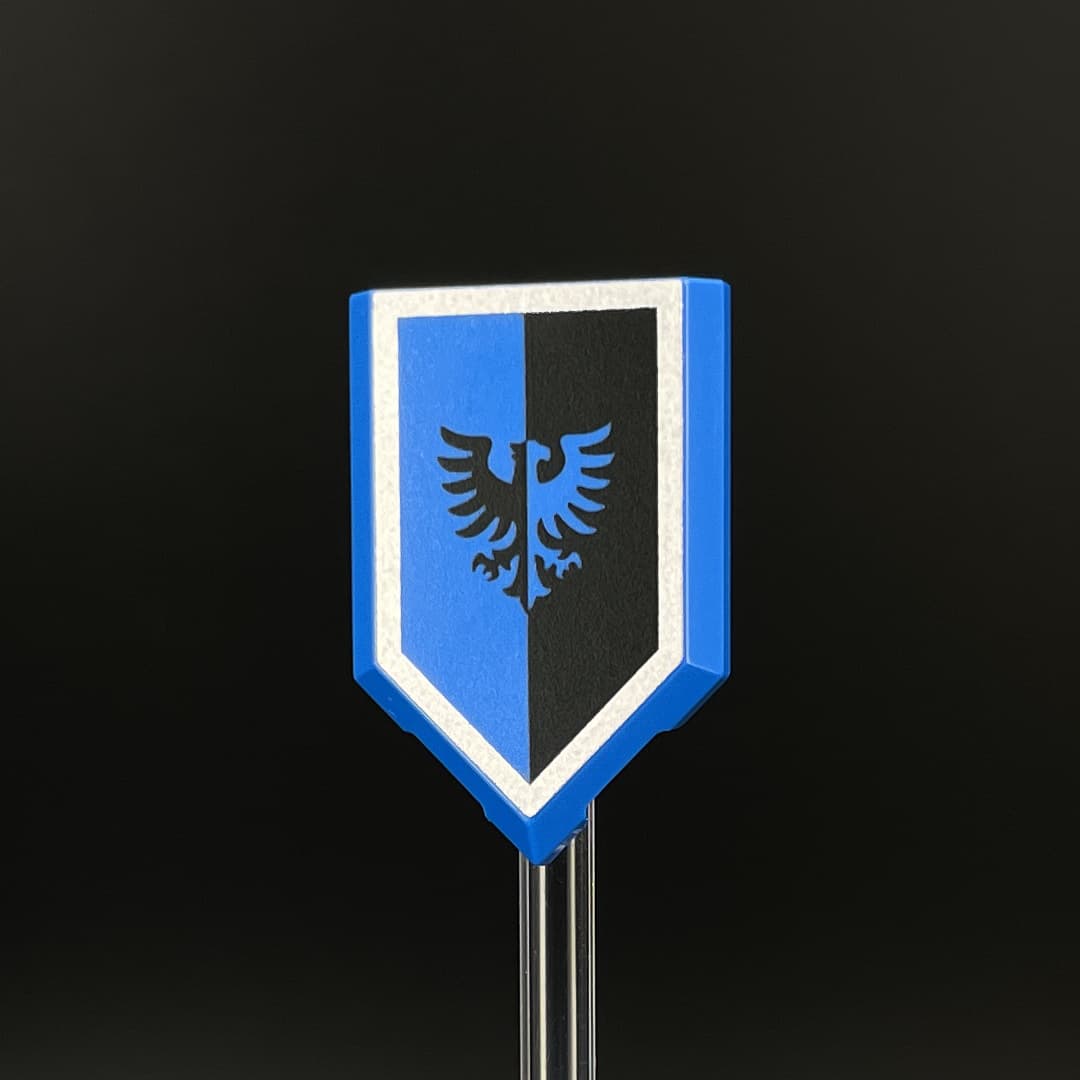 Motiv: Falken Emblem (klein) in Black und Rahmen in Metallic Silver auf einer Blue Fliese.