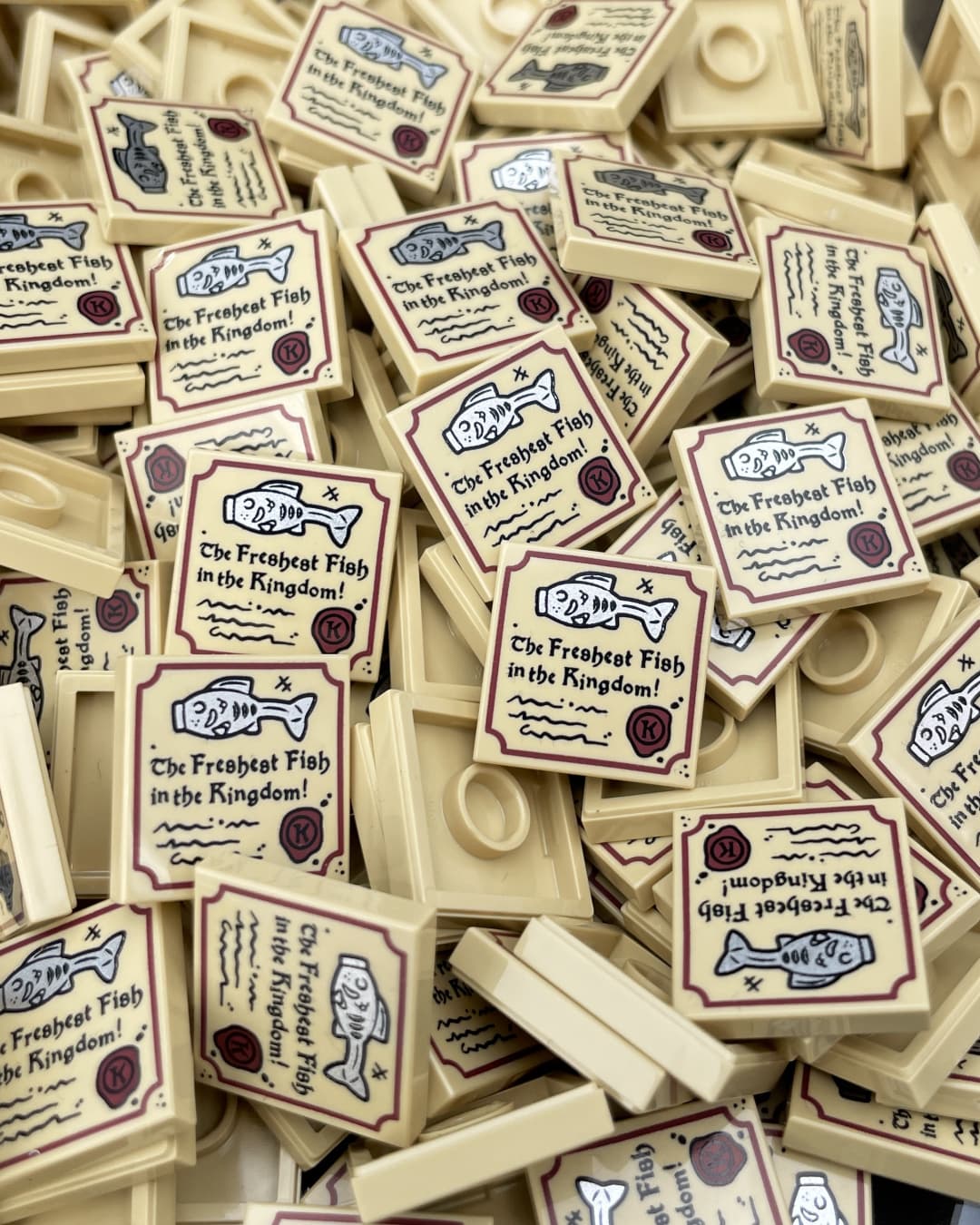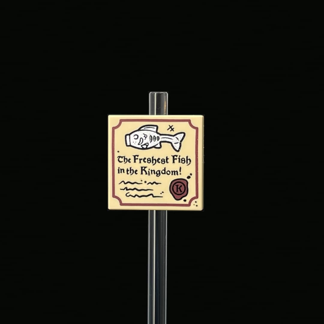 Motiv: Ausgestellte Urkunde für den frischsten Fisch im Reich. Druck in Dark Red, Black und Silver auf einer Tan Fliese.