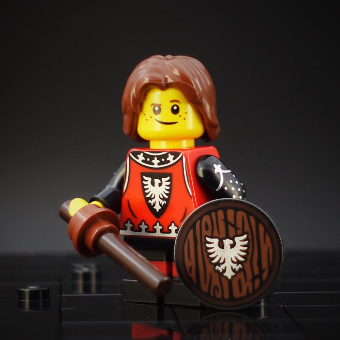 Motiv: Der Erbe der Black Falcons Fraktion. Bestehend aus einem custom bedruckten (modifizierten) Torso- und Schildelement sowie folgenden unmodifizierten Originalteilen: Kopf-, Haar-, und Beinelement, sowie zwei Elementen die ein Holzschwert darstellen.